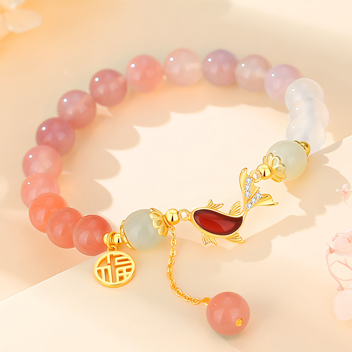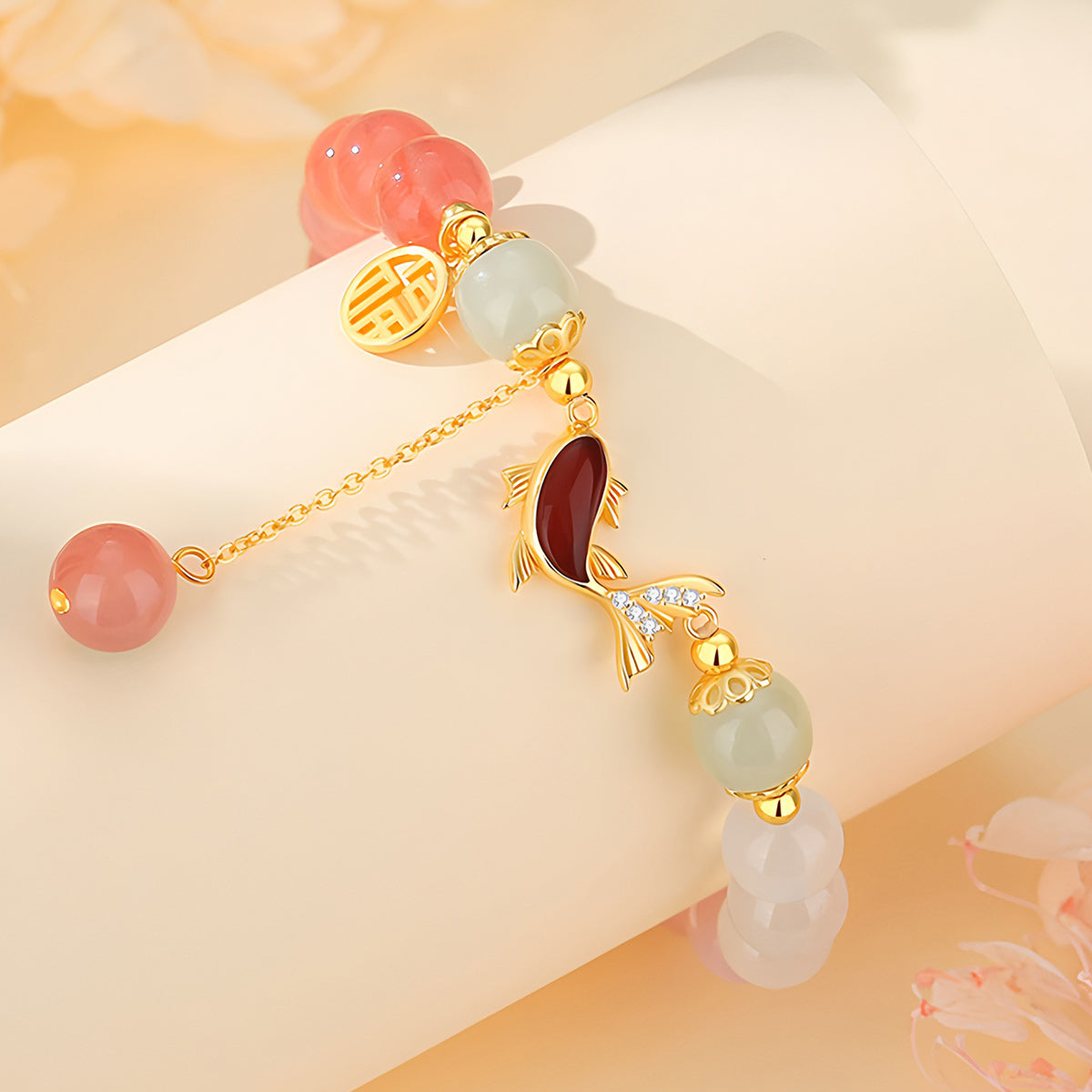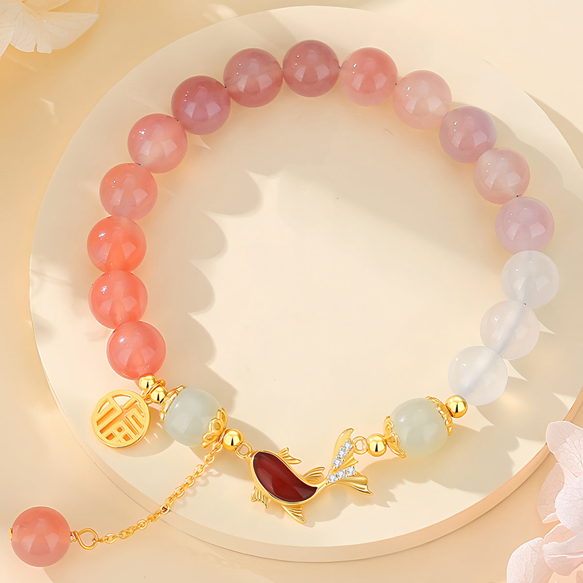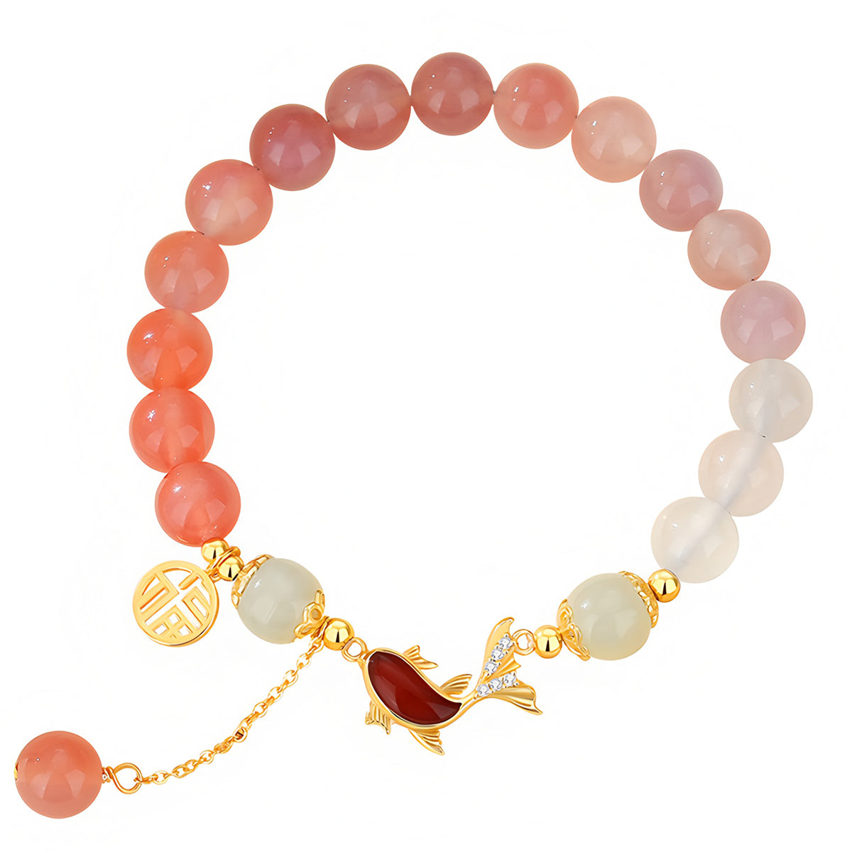 This natural gradient vermicelli agate fish-shaped jade bracelet cleverly combines natural agate with exquisite vermicelli patterns. It is meticulously carved to present a fish-shaped pattern that symbolizes prosperity and harmony.