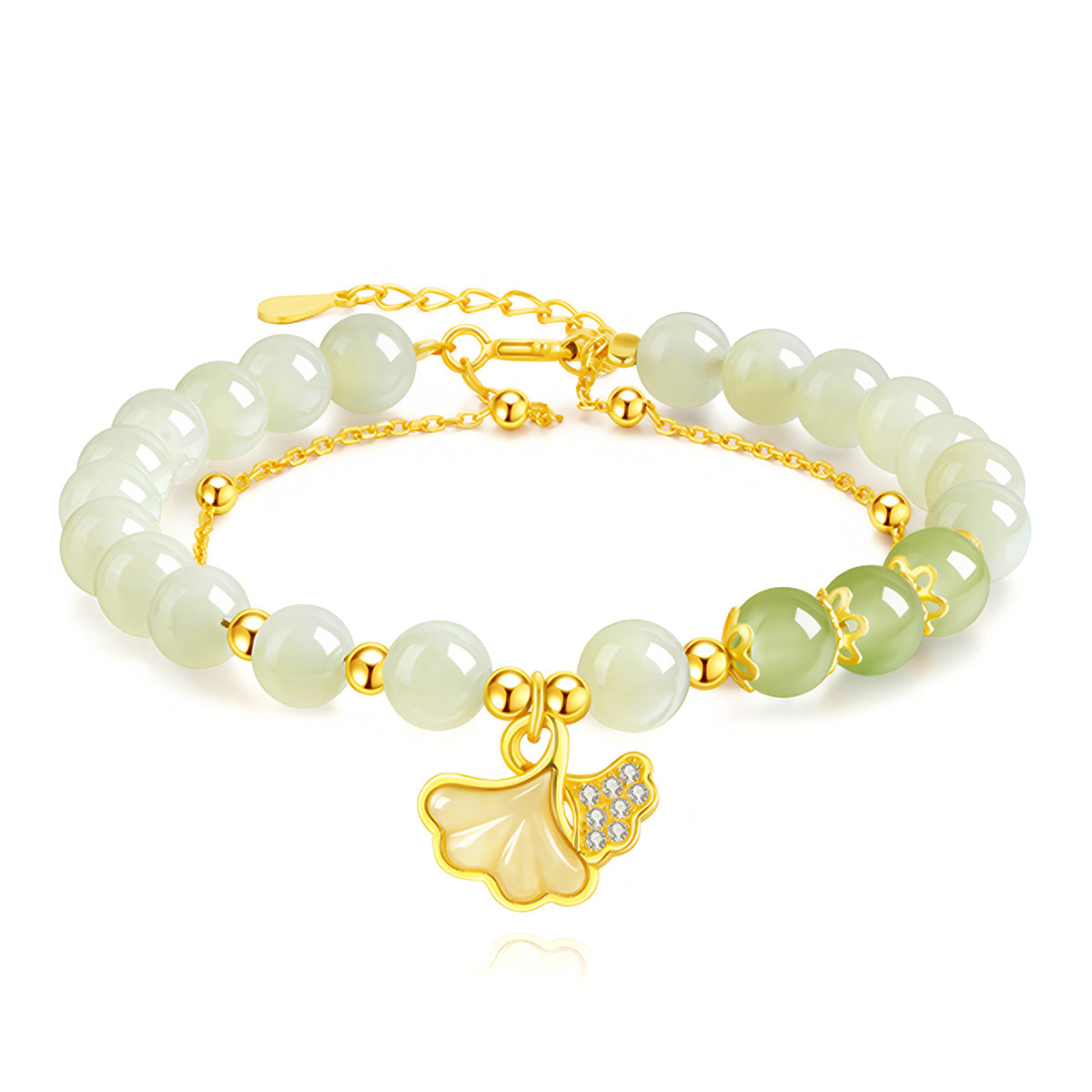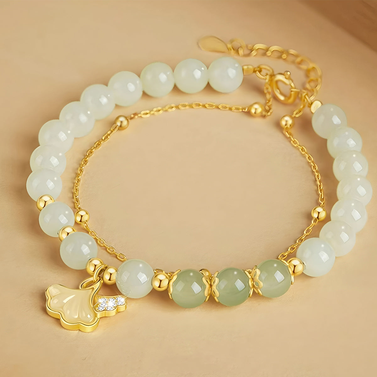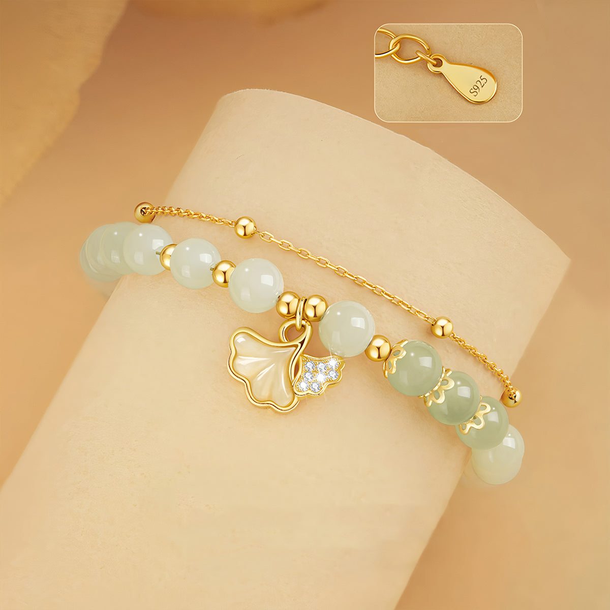 S925 Silver Natural Hetian Jade Apricot Leaf Double Bracelet